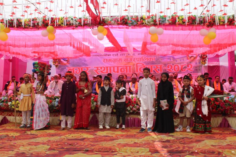 मिति २०८२/१२/१४ गते शनिबारका दिन यस रामग्राम नगरपालिकाका नगर प्रमुख श्री धनपत यादवज्यूको अध्यक्षता र लुम्बिनी प्रदेशका बन तथा वाताबरण मन्त्री माननीय देवकरण कलवारज्यूको प्रमुख आतिथ्यतामा नगर स्थापना दिवस २०८२ ।