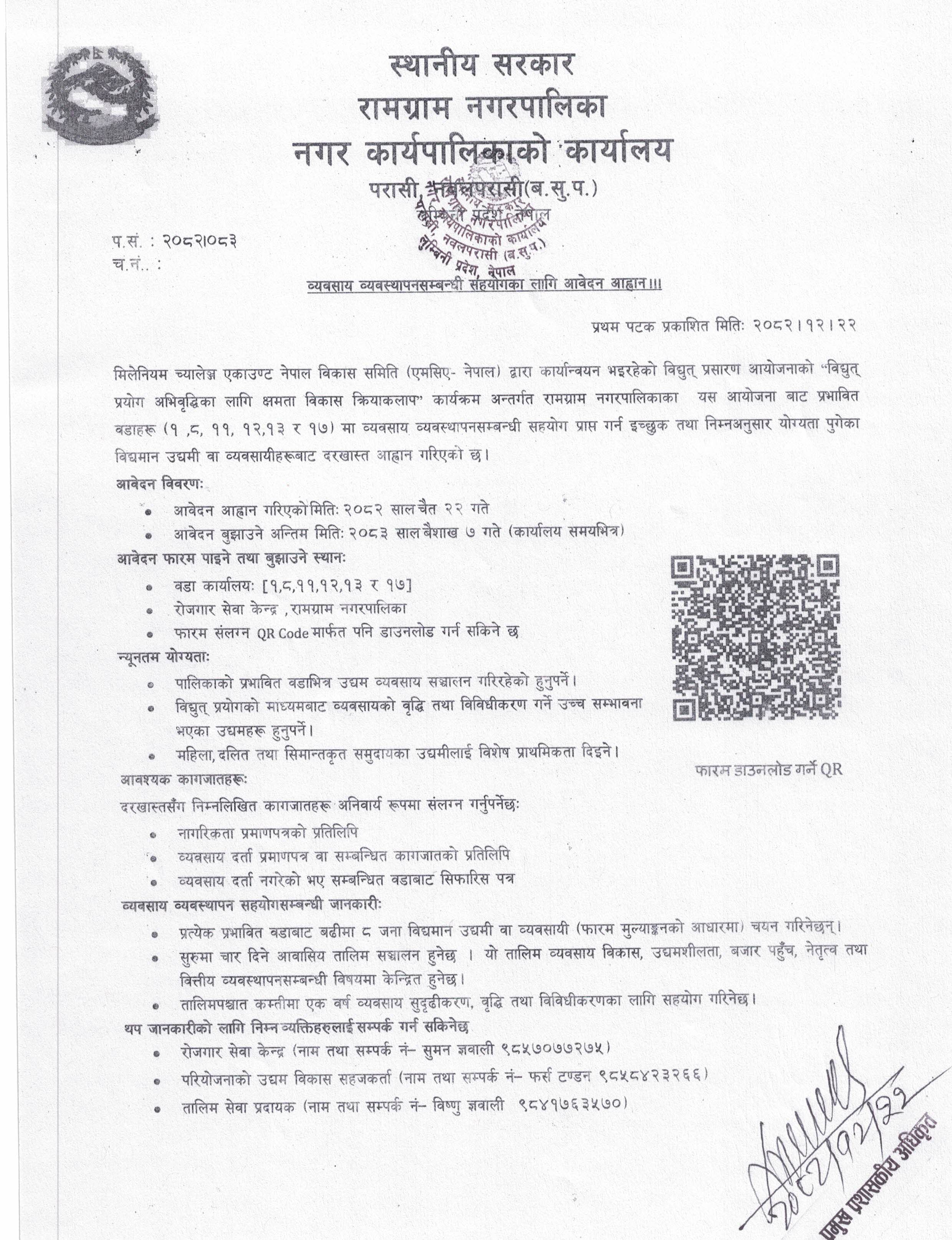 व्यवसाय व्यवस्थापनसम्बन्धी संहयोगका लागि आवेदन आह्वान ।
